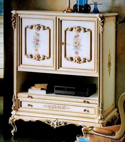 バロック、ロココ様式を昇華させたヴェネチアンスタイル家具です。デコラティブなデザインと優美な曲線、豪華な装飾、クラックレ仕上げ等がその美しさの源泉です。金箔を貼ったゴールドのシリーズはシンプルで気品あるリッチな家具です。