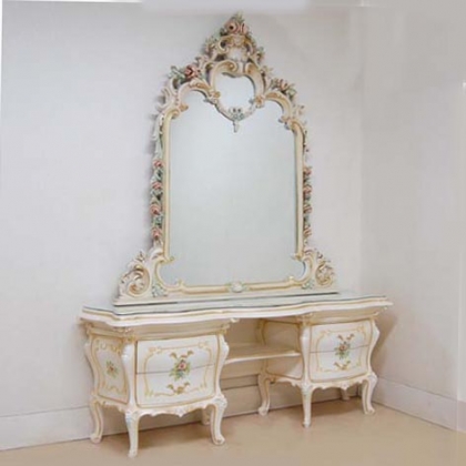 バロック、ロココ様式を昇華させたヴェネチアンスタイル家具です。デコラティブなデザインと優美な曲線、豪華な装飾、クラックレ仕上げ等がその美しさの源泉です。金箔を貼ったゴールドのシリーズはシンプルで気品あるリッチな家具です。