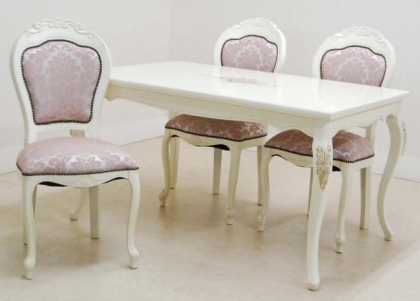 ホワイト塗装フラワーペイント仕上げファブリック:ピンクテーブルx1台チェアーx4脚