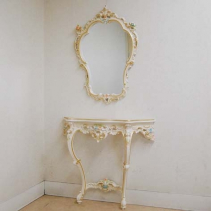 バロック、ロココ様式を昇華させたヴェネチアンスタイル家具です。デコラティブなデザインと優美な曲線、豪華な装飾、クラックレ仕上げ等がその美しさの源泉です。金箔を貼ったゴールドのシリーズはシンプルで気品あるリッチな家具です。