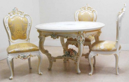 バロック、ロココ様式を昇華させたヴェネチアンスタイル家具です。デコラティブなデザインと優美な曲線、豪華な装飾、クラックレ仕上げ等がその美しさの源泉です。金箔を貼ったゴールドのシリーズはシンプルで気品あるリッチな家具です。