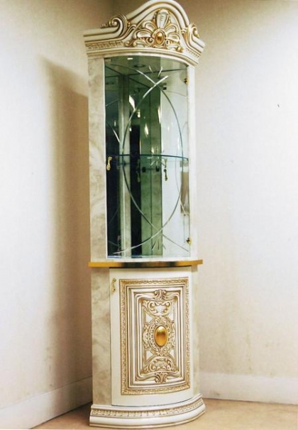 コーナーキャビネット。部屋のデッドスペースを演出する効果があります。背面は三角形になっており部屋の4角のスペースを利用して設置します。正面にガラスはR形状になっており、尖った感をなくし、演出しています。ミラーバックになり、部屋を広く見せる効果もありますので、狭いスペースを有効に利用できます。