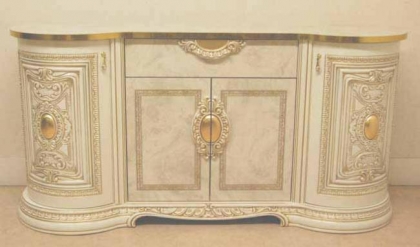 ワイドなサイドボードです。左右のR形状の開き戸と中央にも開き戸が付いております。取っての全てがゴールドの輝き。取ってにもクリスタルが付いておりゴージャス感と可愛らしさを兼ね備えております。