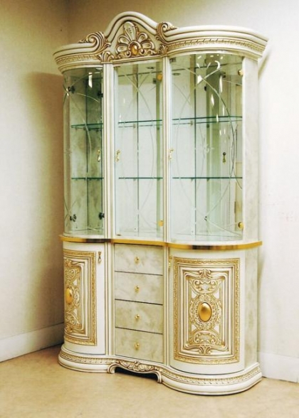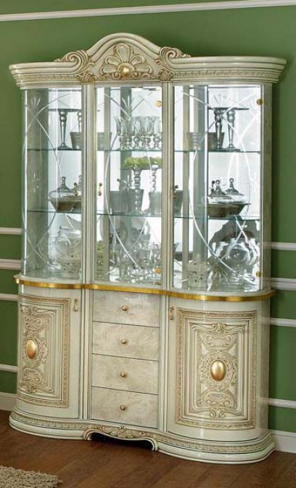 3枚扉のキャビネット。存在感がありますが、左右がり形状になった開き戸になっており、角ばった感がなく、全体的に丸みを帯びたシルエットになっております。ワンランク上の上質な空間を演出してくれます。背面はミラー張りのため部屋を広く感じさせる効果もあります。